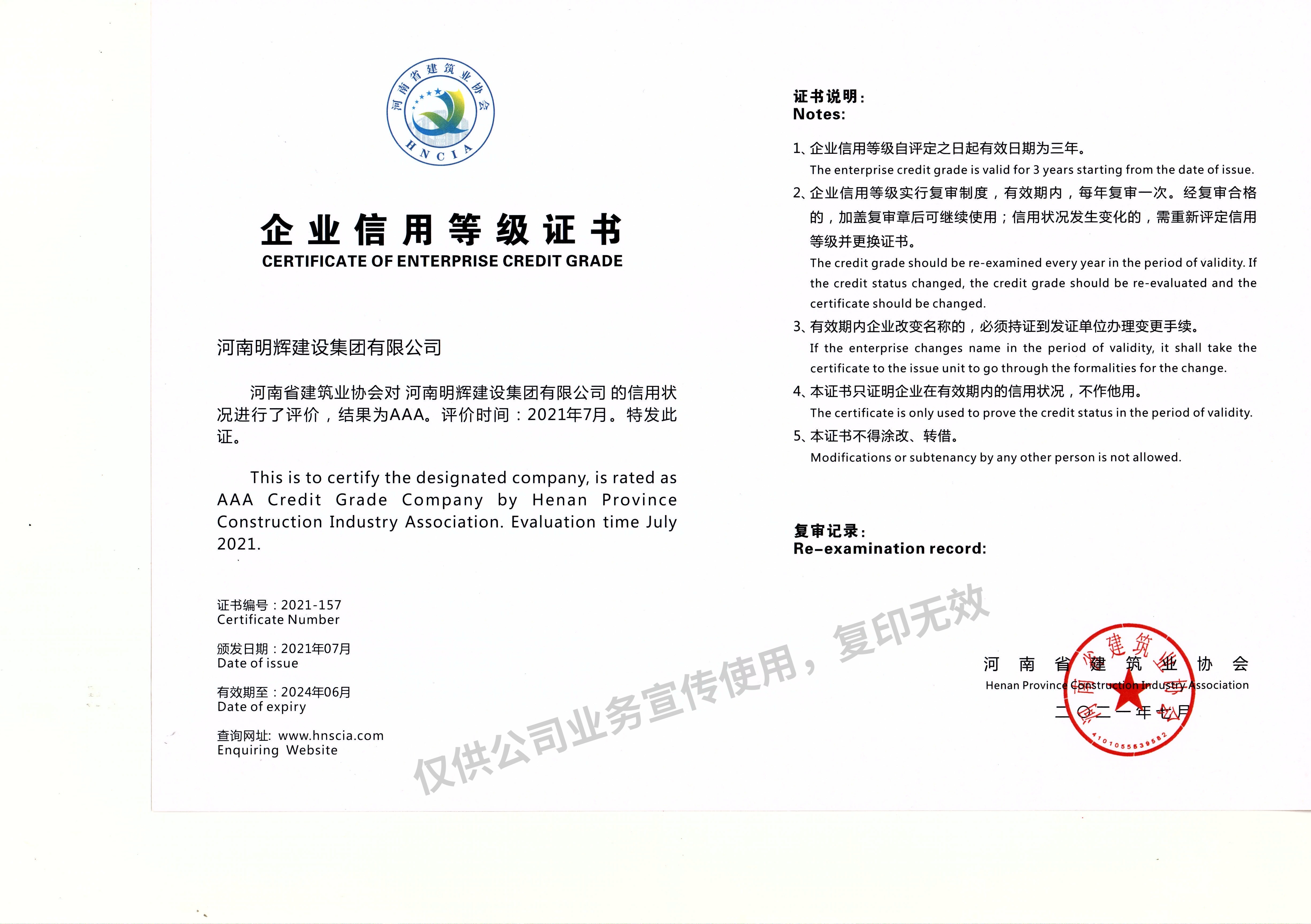 河南省AAA级企业信用等级证书